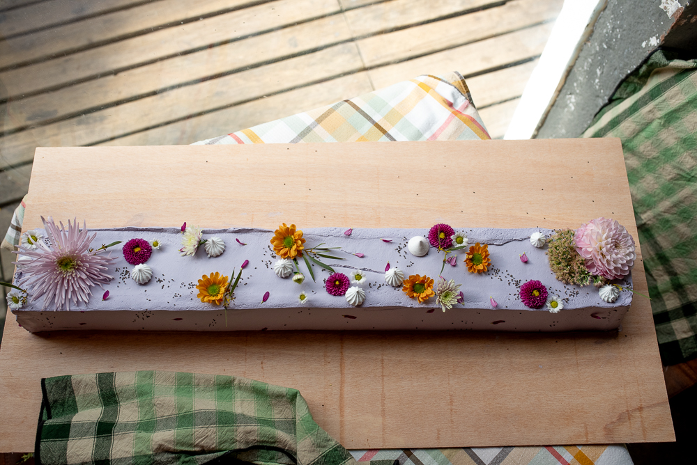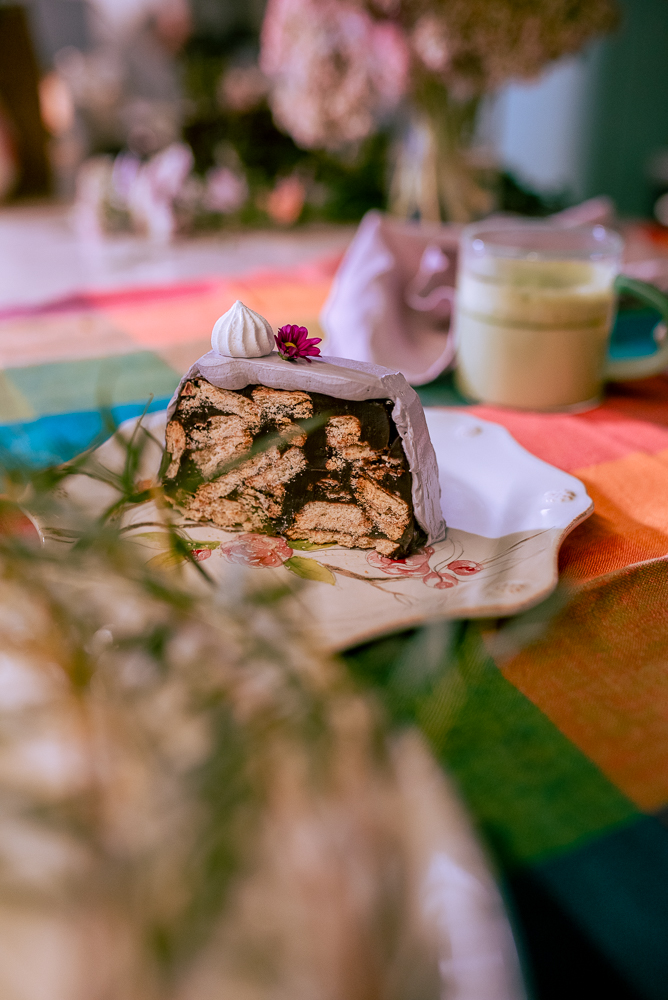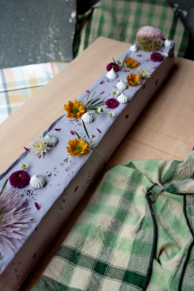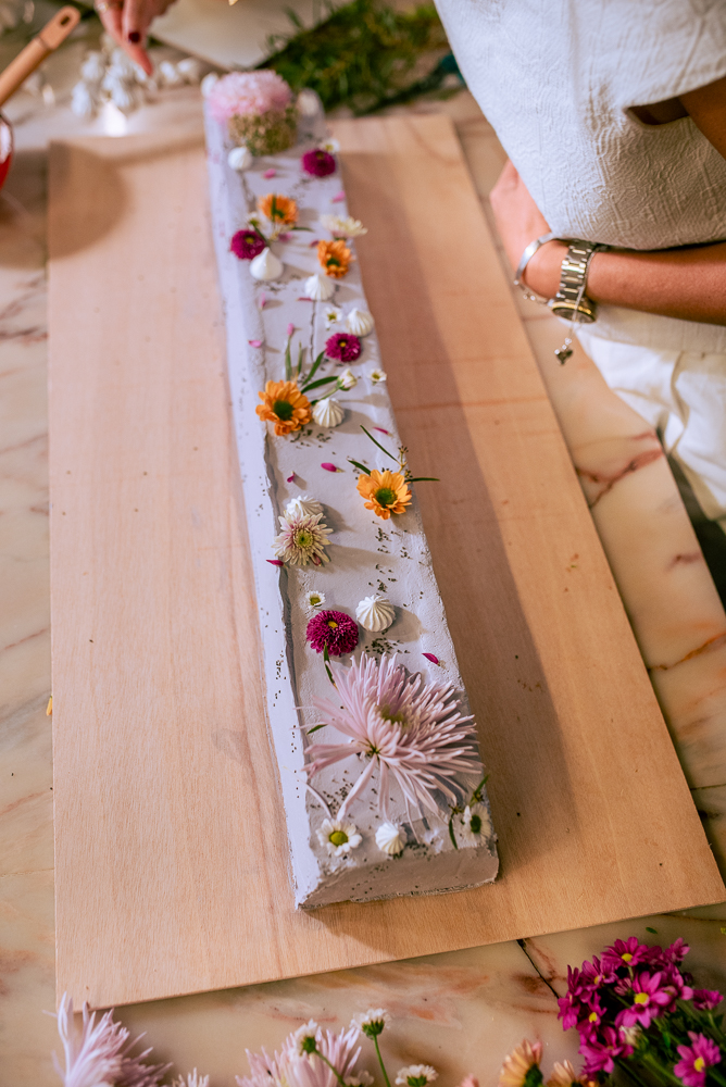 Uma releitura do tradicional salame português com um toque brasileiro. Feito com brigadeiro artesanal, bolacha e finalizado com uma delicada camada de natas lilás. É decorado com flores naturais* e suspiros feitos por nós ♥.