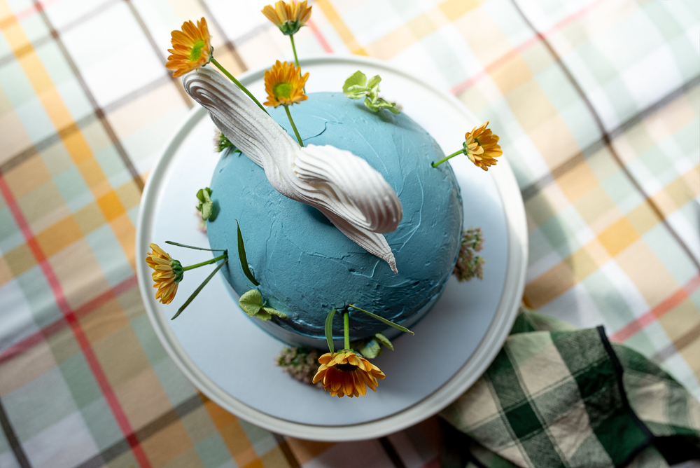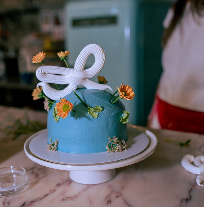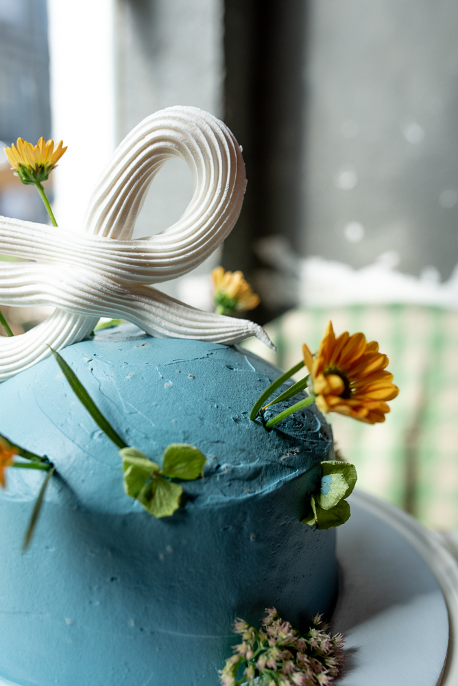 Minibolo delicado com massa leve de coco, recheio cremoso de brigadeiro de coco (o clássico beijinho), coberto com natas azuis, e decorado com flores naturais*.