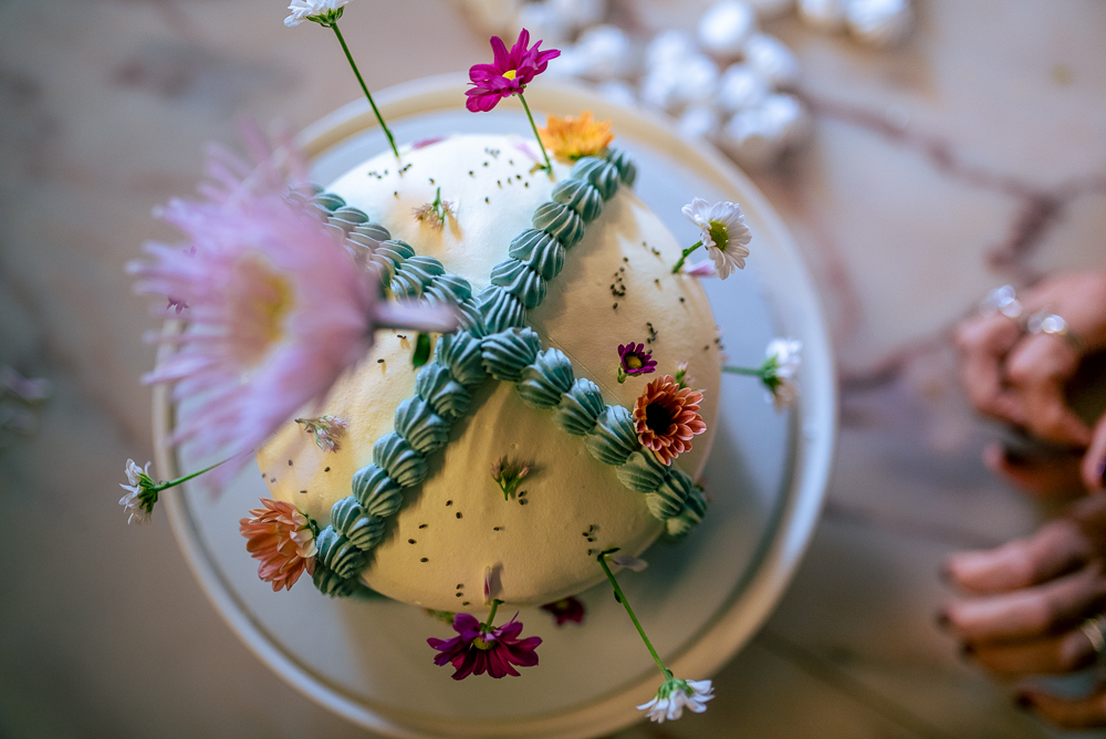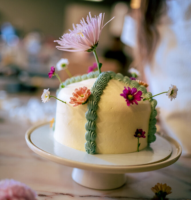 Coberto com natas nos tons suaves de amarelo claro e azul vintage, aplicadas com toque artesanal, e decorado com flores naturais que dão charme e frescor ao visual.