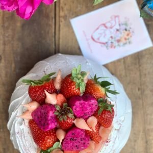 Base de suspiro com recheio de natas e brigadeiro tradicional e, ao todo, frutos vermelhos e minibrigadeiros tradicionais.